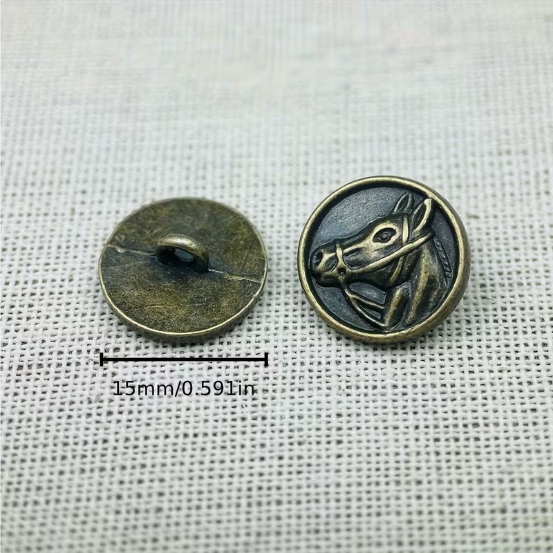 Introducing our exquisite Horse Head Bronze Metal Buttons, a perfect blend of artistry and functionality for your sewing and crafting projects. Each button is meticulously crafted from high-quality bronze, ensuring durability and a timeless aesthetic that will enhance any garment or accessory. Measuring 15mm across, these buttons are designed to be both practical and visually appealing. The intricate design features a detailed depiction of a horse's head, capturing the grace and beauty of this majestic animal. Whether you are creating a bespoke jacket, a stylish bag, or embellishing a unique craft project, these buttons will add a touch of elegance and sophistication. Not only do the Horse Head Bronze Metal Buttons serve as functional fasteners, but they also act as decorative elements that can elevate the overall look of your creations. Their rich bronze finish complements a variety of fabrics and colours, making them versatile for any design scheme. Perfect for equestrian enthusiasts, fashion designers, or anyone looking to add a unique flair to their projects, these buttons are a must-have. Each pack contains five buttons, allowing you to complete projects or create a cohesive look across different items. Enhance your sewing collection with our Horse Head Bronze Metal Buttons, depicting a horse's head, and experience the perfect combination of style and functionality. Order yours today and let your creativity shine!