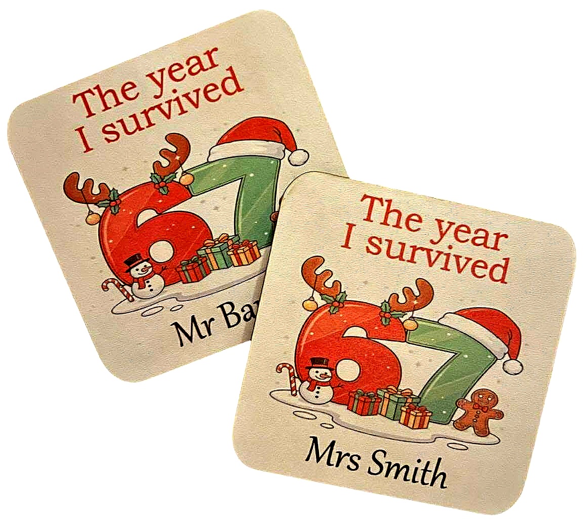 Introducing our exclusive Personalised I Survived 67 Coasters, a unique addition to your home that celebrates surviving the 67 coaster craze. Each coaster is meticulously crafted to provide not only a functional surface for your beverages but also a memorable keepsake that captures the achieving getting though this latest craze. These 9cm x 9cm coasters are made from high-quality materials, ensuring durability and longevity. The vibrant designs are printed using advanced techniques that guarantee the colours remain vivid and striking, even after repeated use. Each coaster features a customisable section where you can add a name, making it a truly personalised item that reflects your individual experiences. Perfect for a teachers end of term gift or for a parent that has witnessed this latest phenomenon. These Personalised I Survived 67 Coasters serve as a conversation starter, allowing you to share your experience of your children this year. Whether you are a coaster enthusiast or looking for a thoughtful gift for a loved one, these coasters are an ideal choice. Embrace the Six Seven craze and elevate your home decor with these stylish and functional coasters. They are not only practical but also a testament to your adventurous spirit. Order yours today and commemorate your coaster experiences in a way that is both personal and stylish. Size 9cm x 9cm. Made by Buttons and Bows Kettering, if you have a request for a custom bespoke order, please contact us. Please make your purchase and at the checkout you can leave the personalisation details required, Thanks. Our postage will discount according to weight, so please feel free to purchase other items within the same weight limit.