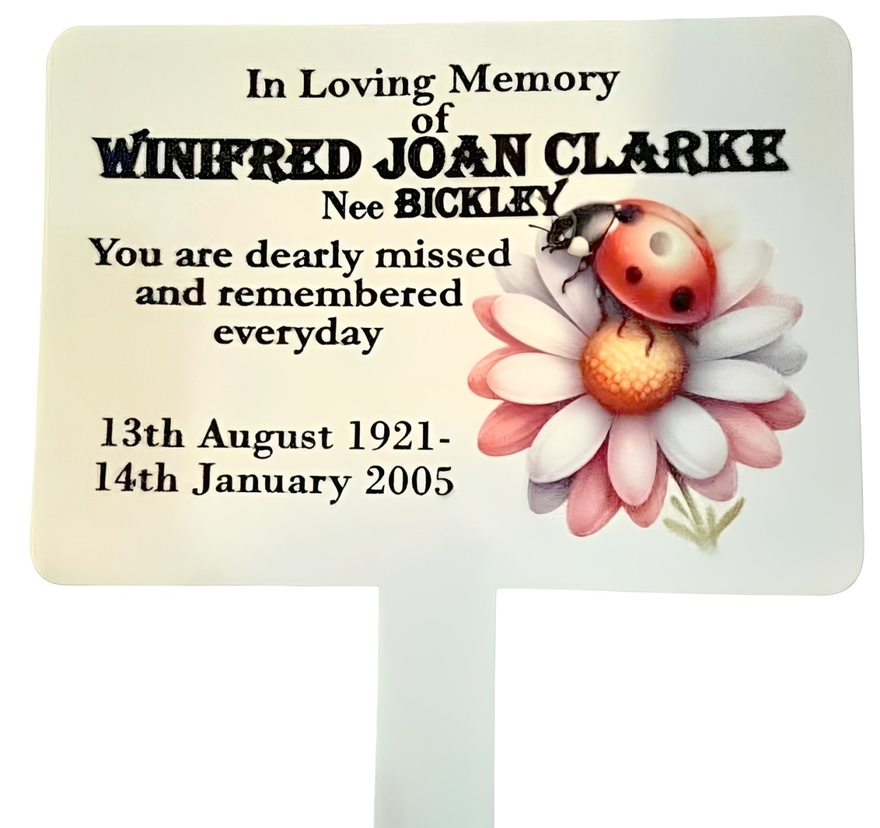 Honour the cherished memories of your beloved with our exquisite acrylic memorial plaque, designed to serve as a lasting tribute to those who have touched your life. This elegant plaque is not merely a marker, it is a heartfelt expression of love and remembrance, perfect for commemorating the life of a dear friend, family member, or even a beloved pet. Crafted with care, this memorial plaque is an ideal addition to any special place that holds significance in your heart, allowing you to keep the memory of your loved one alive. Our memorial plaque features a stunning design that seamlessly blends beauty with durability. The unique sublimation process ensures that the personalised wording and images are embedded directly into the acrylic, providing a long-lasting finish that resists fading and scratching. This means that whether placed indoors or outdoors, your tribute will remain as vibrant as the memories it represents. Measuring 12cm x 17cm, with an overall height of 26cm when including the stake, this plaque is perfectly sized to make a meaningful statement without overwhelming the surrounding environment. You have the freedom to customise the wording and background to reflect the essence of your loved one, whether it be a name, a heartfelt message, or a significant date. The possibilities are endless, allowing you to create a truly unique memorial that resonates with your personal sentiments. To order, simply provide the desired text and image during the chequeout process. Whether you wish to include a robin, ladybird, or any other symbol that holds special meaning, we are here to help you craft a beautiful tribute that honours the life and legacy of your cherished one. Celebrate their memory with a memorial plaque that speaks to the heart and serves as a constant reminder of the love shared.