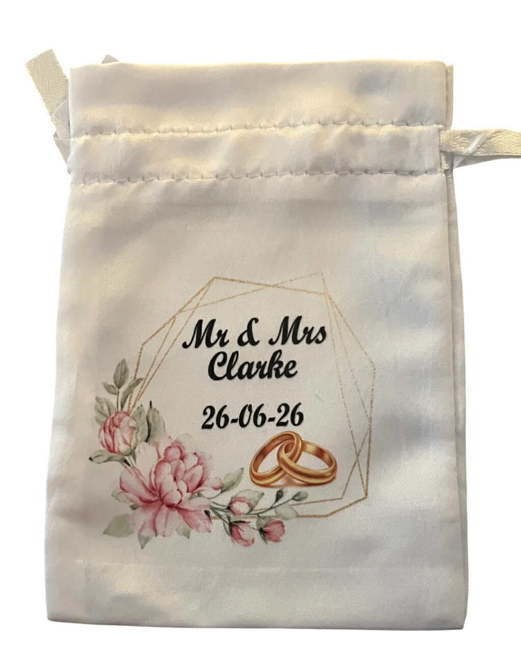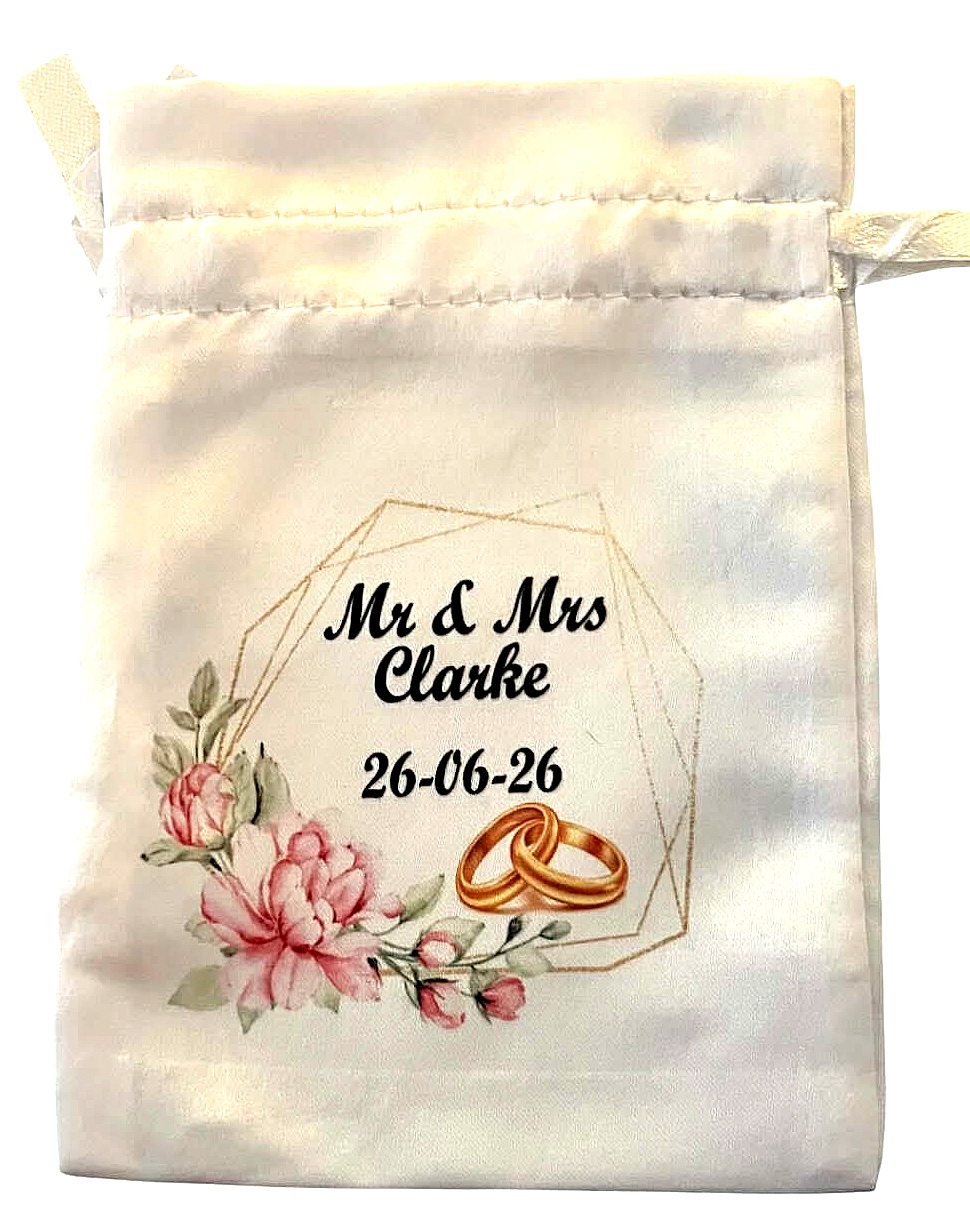 Introducing our exquisite Personalised Wedding Ring Bag, a perfect blend of elegance and functionality designed to safeguard your cherished wedding rings on your special day. Crafted with meticulous attention to detail, this luxurious bag is not only a practical accessory but also a beautiful keepsake that adds a personal touch to your wedding ceremony. Each Personalised Wedding Ring Bag is made from high-quality materials, ensuring durability and a soft, luxurious feel. The interior is lined with a gentle fabric that protects your rings from scratches and damage, while the exterior can be customised with your names, wedding date, or a heartfelt message, making it a unique addition to your wedding ensemble. Size 10cm x 15cm, our Personalised Wedding Ring Bag complements any wedding theme, from classic to contemporary. The thoughtful design features a secure closure, ensuring that your rings remain safe and secure until the moment you exchange vows. This bag is not only ideal for the bride but also makes a thoughtful gift for bridesmaids or as a cherished family heirloom. Make your wedding day even more memorable with our Personalised Wedding Ring Bag. It serves as a beautiful reminder of your love story and the promises you make to each other. Order yours today and add a touch of personalised elegance to your wedding preparations. Please leave wording required at the checkout, thanks. Any issues we will contact you to clarify. Many thanks