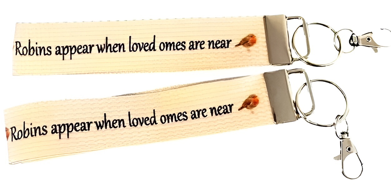 Introducing the exquisite When Robins Appear Keyring Wristlet, a perfect blend of functionality and elegance. This beautifully crafted key fob is designed to keep your keys organised while adding a touch of charm to your daily essentials. These When Robins appear wristlet keyrings are a great reminder of those people we have loved and lost over the years. These are not only sentimental, but also a practical way to hang from your keys, or a tag on your bag. Dimensions: 2.5cm x 28cm. Made in the UK by Buttons and Bows Kettering Northamptonshire. Made from high-quality materials, the wristlet features a stunning robin motif, symbolising renewal and hope, making it an ideal gift for loved ones or a delightful treat for yourself. The When Robins Appear Keyring Wristlet is not just a practical accessory, it is a statement piece that reflects your unique style. Its durable construction ensures that it withstands the rigors of everyday use, while the soft wrist strap provides comfort and ease of carrying. Whether you are heading to work, running errands, or enjoying a leisurely day out, this key fob will keep your keys secure and easily accessible. With its thoughtful design, the When Robins Appear Keyring Wristlet allows you to effortlessly attach your keys, making it a convenient addition to your handbag or backpack. The vibrant colours and intricate details of the robin motif are sure to catch the eye, making it a conversation starter wherever you go. Elevate your accessory game with the When Robins Appear Keyring Wristlet. It is not merely a key fob, it is a reflection of your personality and a reminder of the beauty of nature. Embrace the spirit of renewal and let this charming wristlet accompany you on all your adventures.
